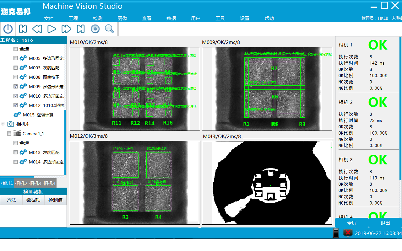 “HK-V6500N視覺(jué)控制器”,應(yīng)用于四相機(jī)LED缺陷檢測(cè),搭載視覺(jué)處理軟件MVS,采用交叉點(diǎn)定位或者匹配定位基于二值化、圖像校正插件、LED極性判斷、LED缺角檢測(cè)、LED亮色缺陷檢測(cè)、LED邊緣變形檢測(cè)等插件,實(shí)現(xiàn)LED缺陷檢測(cè)能。